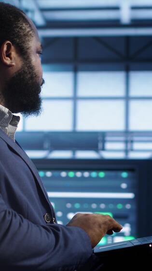 Vertical African american man walking in high tech facility, using laptop to patch network issues leading to slow data transfer rates. Data center worker fixing errors affecting supercomputers, camera A Pro Video