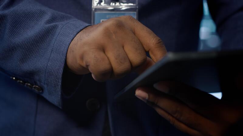 Technician in server hub checking recovery plan on tablet, monitoring energy consumption across mainframes. Close up shot of man in data center making sure rigs are functioning optimally, camera A Pro Video
