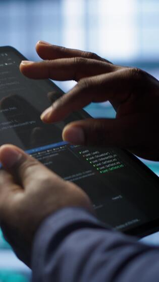 Vertical Software developer does yearly checkup using tablet to prolong data center electronics life span. Close up shot of worker in server room monitoring server infrastructure using digital device, camera A Pro Video