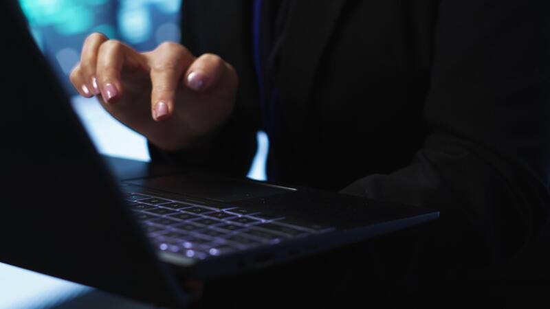 Programmer in server hub checking recovery plan on laptop, monitoring energy consumption across mainframes. Close up of employee using notebook in data center, ensuring rigs are functioning, camera A Pro Video