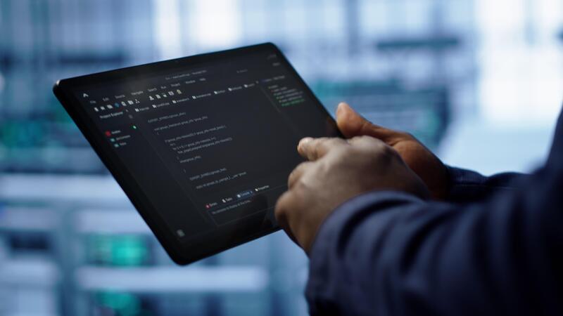 Programmer monitoring server room rigs, doing checkup, inputting data on tablet of needed fixes. IT specialist working in data center facility housing storage hardware, camera A close up Pro Video
