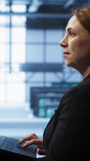 Vertical System administrator in server hub checking recovery plan on laptop, monitoring energy consumption. IT expert uses notebook in data center workspace, ensuring rigs are functioning optimally, camera A Pro Video