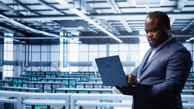 African american IT operator doing maintenance using laptop to prolong data center equipment life span. IT professional in server hub workspace monitoring server mainframes using notebook, camera B Pro Video