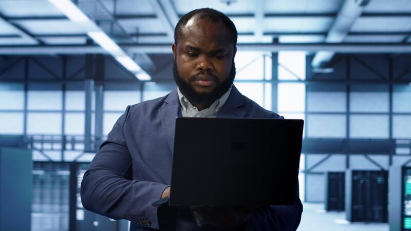 Computer scientist in data center using diagnostic tools and system monitoring software on laptop to identify cause of errors. IT specialist in server farm establishment repairing equipment, camera A Pro Video