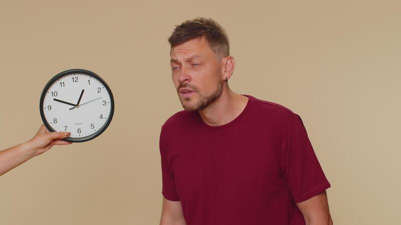 Man with anxiety checking time on clock, running late to work, being in delay, deadline Pro Video