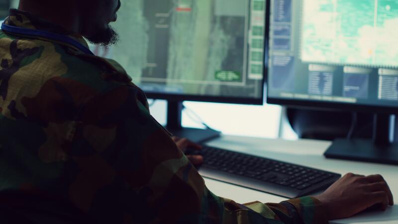 Soldier implements and processes tactical data with reconnaissance radar system, creating comprehensive battlefield maps to aid troops in the operational field. Intelligence for a mission. Camera A. Pro Video