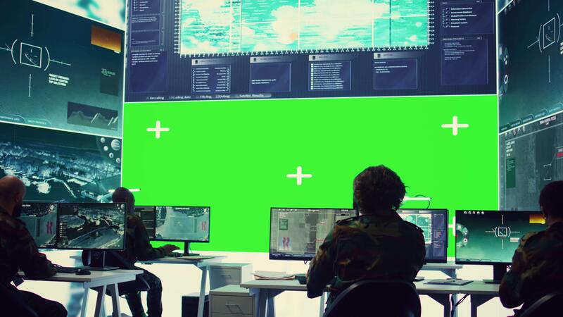 Team of IT military specialists working with a greenscreen on a big display, searching for real time data via reconnaissance CCTV system. Soldiers in power base transmitting information. Camera B. Pro Video