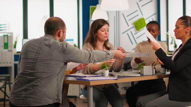 Young diverse team of workers talking, looking at documents and analyzing graphs data sitting at workplace desk in start up company. Professional colleagues team discussing marketing project. Pro Video
