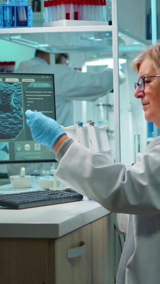 Vertical . Medical research scientist typing codes on pc in biological applied science modern equipped laboratory overwork. Lab engineers conducting experiment for vaccine development against covid19 virus Pro Video