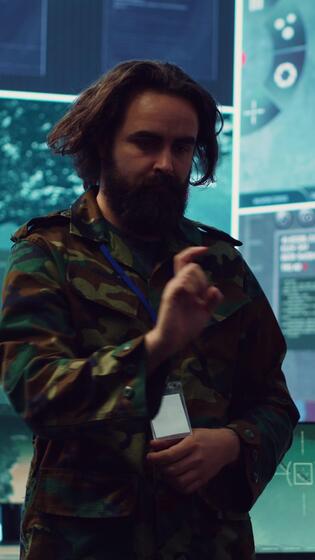 Vertical Command sergeant major employs high tech holograms to examine real time data for a mission, working on ways to protect the national coast line. Creating an attack plan. Camera A. Pro Video