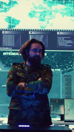 Vertical Army superior officers creating an attack plan using a hologram to gather real time information, working together to ensure national safety in a command center. Military operations. Camera B. Pro Video