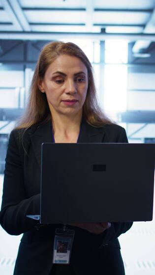 Vertical Software developer walking in data center, overseeing server operations using laptop. Woman ensuring optimal performance and data integrity in server farm using notebook, camera B Pro Video