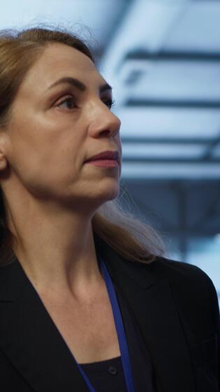 Vertical Manager inspecting server room equipment, walking between supercomputers. Supervisor doing evaluation of data center location, checking equipment, monitoring performance, camera A Pro Video
