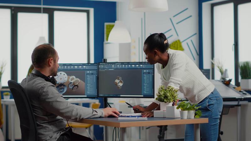 Diverse team of engineers working on computer at mechanical piece design cad sharing ideas about industrial project using dual displays setup. Black manager analysing 3D gears on CAD software. Pro Video