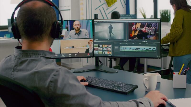 Project manager in web online meeting with team on call editing client work, getting feedback on commercial movie using post production software on computer in start up creative agency office Pro Video