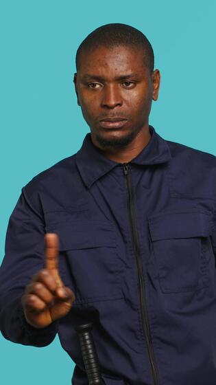 Vertical Security guard doing no gesturing with finger, prohibiting public access in restricted area. Portrait of stern bodyguard barring people from entering place, studio background, camera A Pro Video