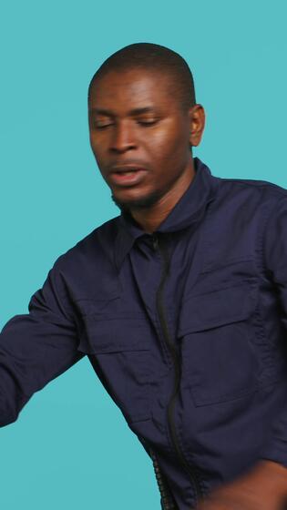 Vertical Security guard doing stop sign gesturing, being tasked with preventing public access in restricted area. Portrait of stern bodyguard pushing back unwanted visitors, studio background, camera A Pro Video