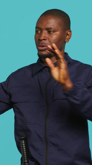 Vertical Portrait of security agent doing crowd control, securing assigned post, studio background. African american guardian pushing back unwanted trespassers, handling security breaches, camera A Pro Video