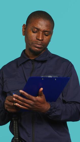 Vertical Security guard holding clipboard, taking notes, receiving orders during protection job shift. Portrait of bodyguard using pen to write informations received, studio background, camera A Pro Video