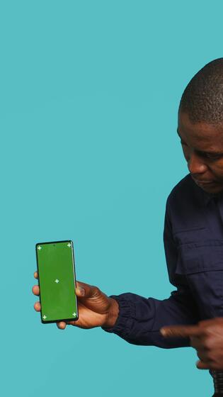 Vertical Portrait of security agent presenting mockup phone and securing assigned post, studio background. Guardian showing green screen smartphone while handling security breaches Pro Video
