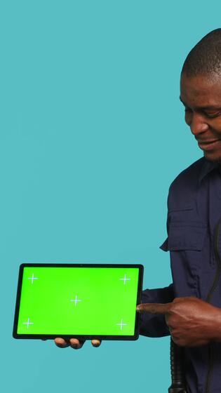 Vertical Portrait of happy security staff member showing isolated screen tablet. Joyous patrolling agent maintains secure environment, showcasing chroma key device, studio background, camera A Pro Video