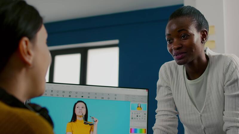 Team of multiethnic retouchers working with modern photo editing software app in digital multimedia company. Project manager consulting designer colleague discussing about retouching portrait Pro Video