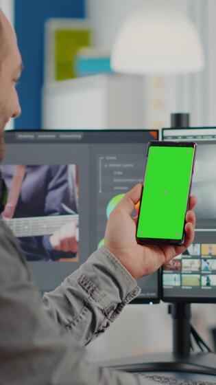 editor talking on call holding smartphone with green screen, chroma key mock up isolated display taking break from retouching movie sitting in start up office. Team working in background Pro Video