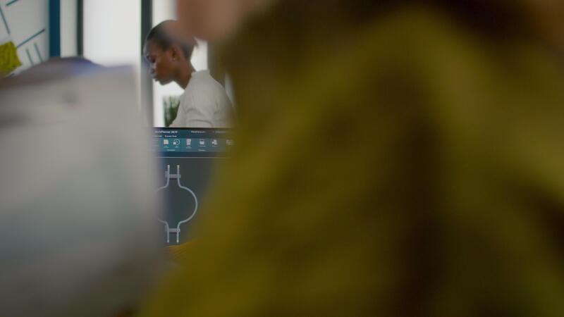 Colleagues discussing about industrial project analysing 3D gears looking at computer with CAD software and writting on sticky notes. Industrial engineer and manager working in creative office Pro Video