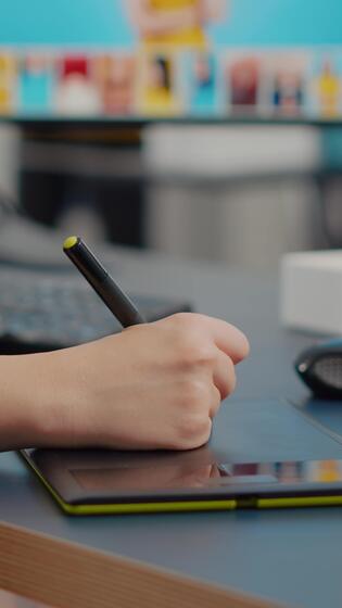 Close up of color designer freelancer photographer editing customer photo using computer with two displays and stylus pen. Graphic editor retouching assets drawing on graphic tablet in creative agency Pro Video