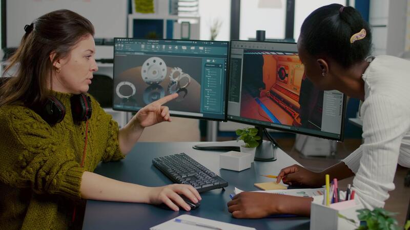 Gamer creator explaning to african worker how testing game level interface, developing new design in creative office using pc with two monitors. Player online games with technology network wireless. Pro Video