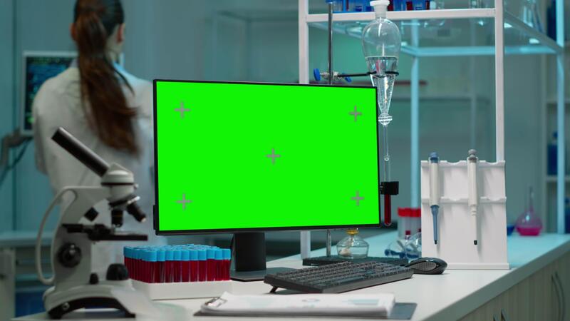 Desktop computer with green screen, mock up on display placed on desk in scientific laboratory while woman medical research scientist analysing virus evolution at digital monitor conducting experiment Pro Video