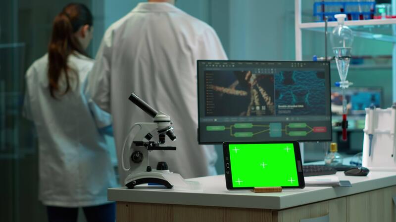 Tablet with green screen working in labooratory with mock up, chroma key display while professional engineer testing virus evolution in background. High tech development lab with blood samples Pro Video