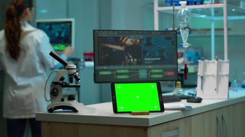 Notepad with green screen working in labooratory with mock up monitor, chroma key display while professional engineer testing virus evolution in background. High tech development lab. Pro Video