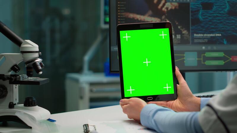 Close up of scientist woman holding tablet with green mockup in modern equipped lab. Team of microbiologists doing vaccine research writing on device with chroma key, isolated display. Pro Video