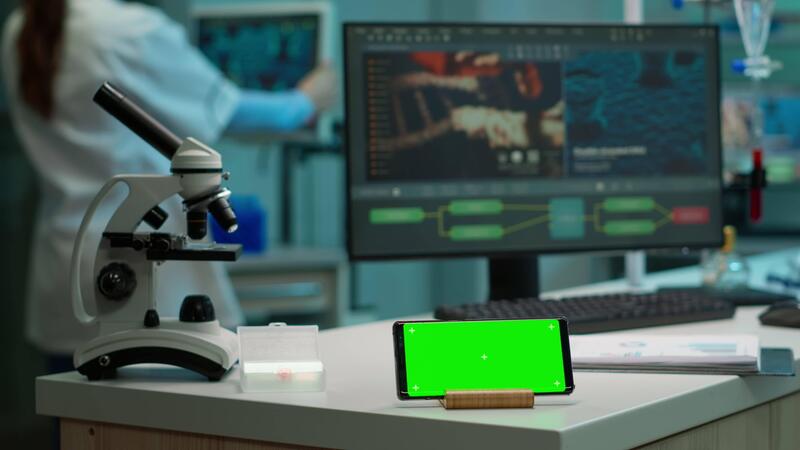 Horizontal mobile phone with green screen working in labooratory with mock up template, chroma key display while professional engineer testing virus evolution in background. High tech development lab. Pro Video