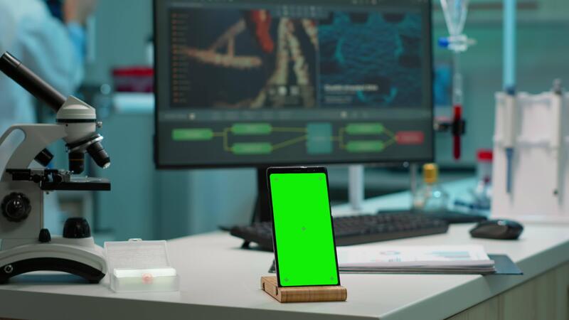 Smartphone with green screen working in laboratory with mock up, chroma key display while professional engineer testing virus evolution in background. High tech development lab with blood samples Pro Video