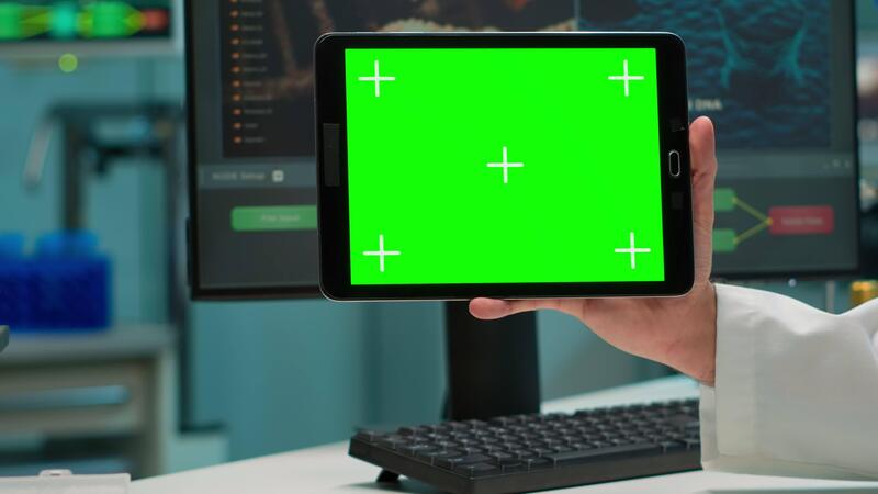 Close up of scientist man holding tablet with green mockup in modern equipped lab. Team of microbiologists doing vaccine research writing on device with chroma key, isolated display. Pro Video