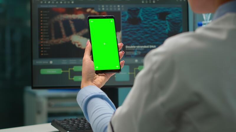 Back view of microbiologist doctor woman looking at mobile phone with green mockup in modern equipped lab. Team of scientist doing vaccine research writing on device with chroma key, isolated display Pro Video