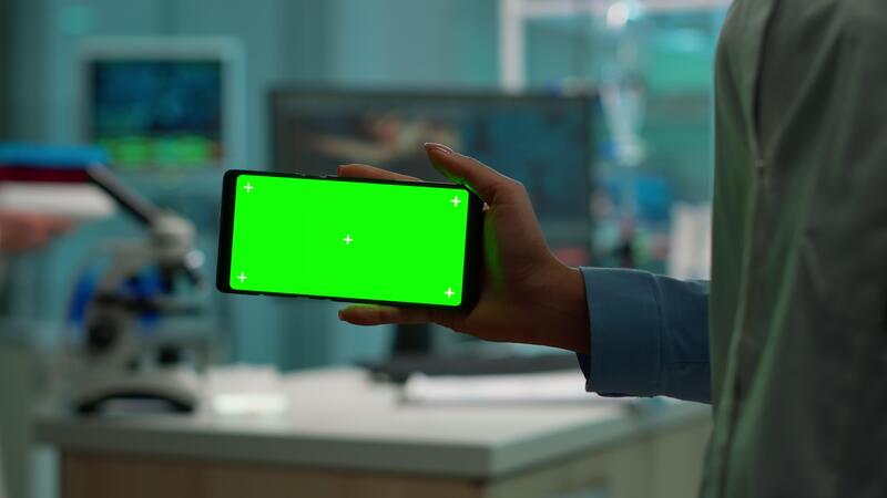 Microbiologist holding smartphone with green chroma key display in front of camera in modern equipped lab. Team of biotechnology scientists developing drugs using tablet with mock up screen. Pro Video