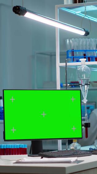 Vertical . Team of scientists working in background of modern laboratory using computer with green screen, mockup display, chroma key monitor, analysing experiment evolution, high tech development lab. Pro Video