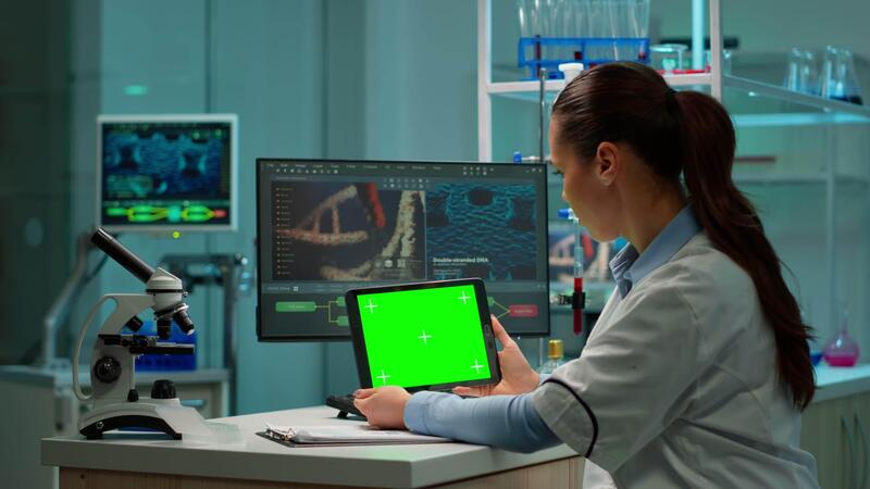 Scientist holding tablet with green mockup, looking on device with chroma key, isolated display. Microbiologists doing virus research, in background man lab researcher working at vaccine developent. Pro Video