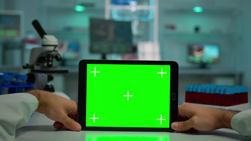 Pov shot of microbiologist holding tablet with green chroma key display sitting at desk working reading virus symptoms. In background lab researcher analysing vaccine developent examining samples Pro Video