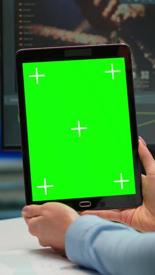 Vertical . Close up of scientist woman holding tablet with green mockup in modern equipped lab. Team of microbiologists doing vaccine research writing on device with chroma key, isolated display. Pro Video