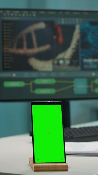 Vertical . Display phone with green screen, mock up on template placed on desk in scientific lab while team of medical researcher scientists analysing virus evolution at digital monitor conducting experiment Pro Video