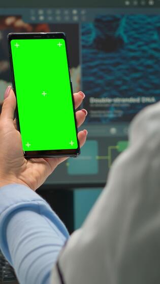 Vertical . Back view of microbiologist doctor woman looking at mobile phone with green mockup in modern equipped lab. Team of scientist doing vaccine research writing on device with chroma key, isolated display Pro Video