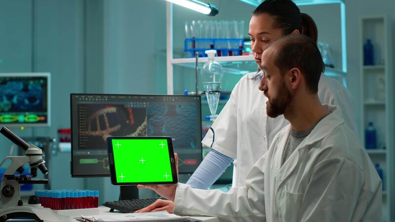 Man research scientist has conversation with famale bioengineer next to a desktop computer holding tablet with green screen mock up. They look at chroma key pc template in a modern science laboratory. Pro Video