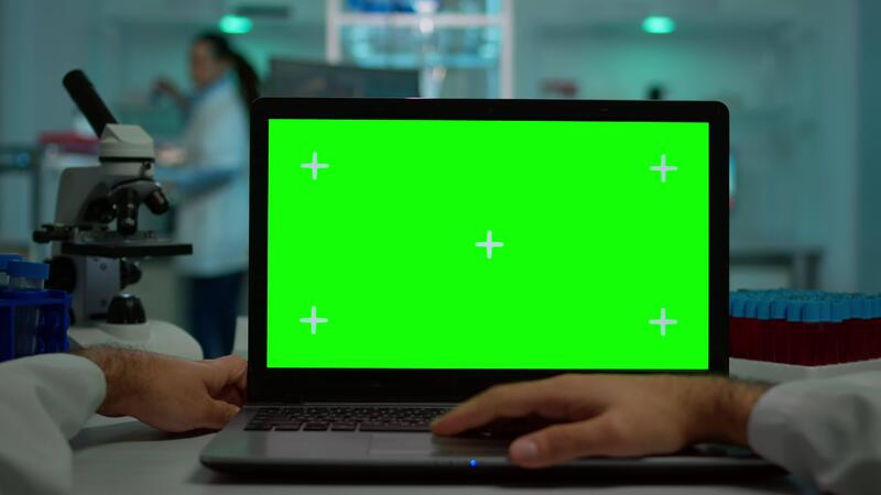 Pov shot of microbiologist typing on laptop with green chroma key display sitting at desk working reading virus symptoms. In background lab researcher analysing vaccine developent examining samples Pro Video