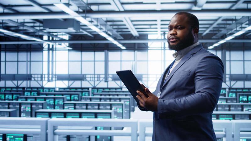 IT operator doing maintenance using tablet to prolong data center equipment life span. IT professional in server hub workspace monitoring server mainframes using digital device, camera B Pro Video