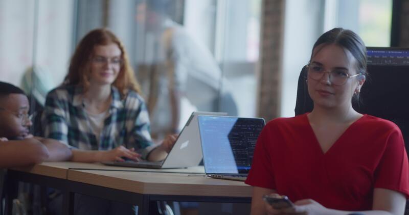 A diverse group of colleagues collaborates using laptops, mobiles, and tablets to tackle business challenges and enhance productivity through teamwork and innovative technology. Pro Video