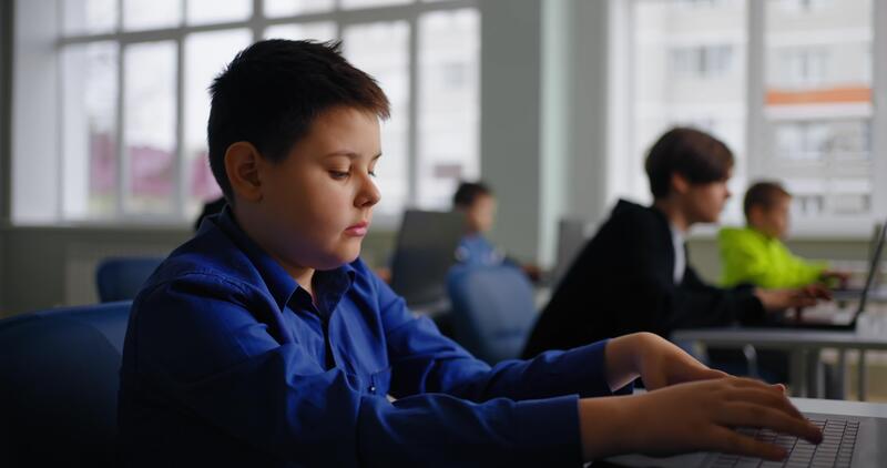 Cute Little Boy Learning Coding In IT Classes, Portrait Of School Student In Computer-Based Class Pro Video